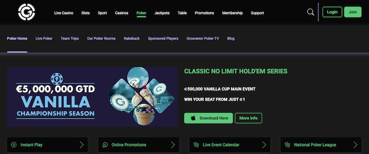 | Grosvenor Poker | 4.7/5 | £30 Bonus + 100% Match up to £100 | Online-to-Live Satellite Path |